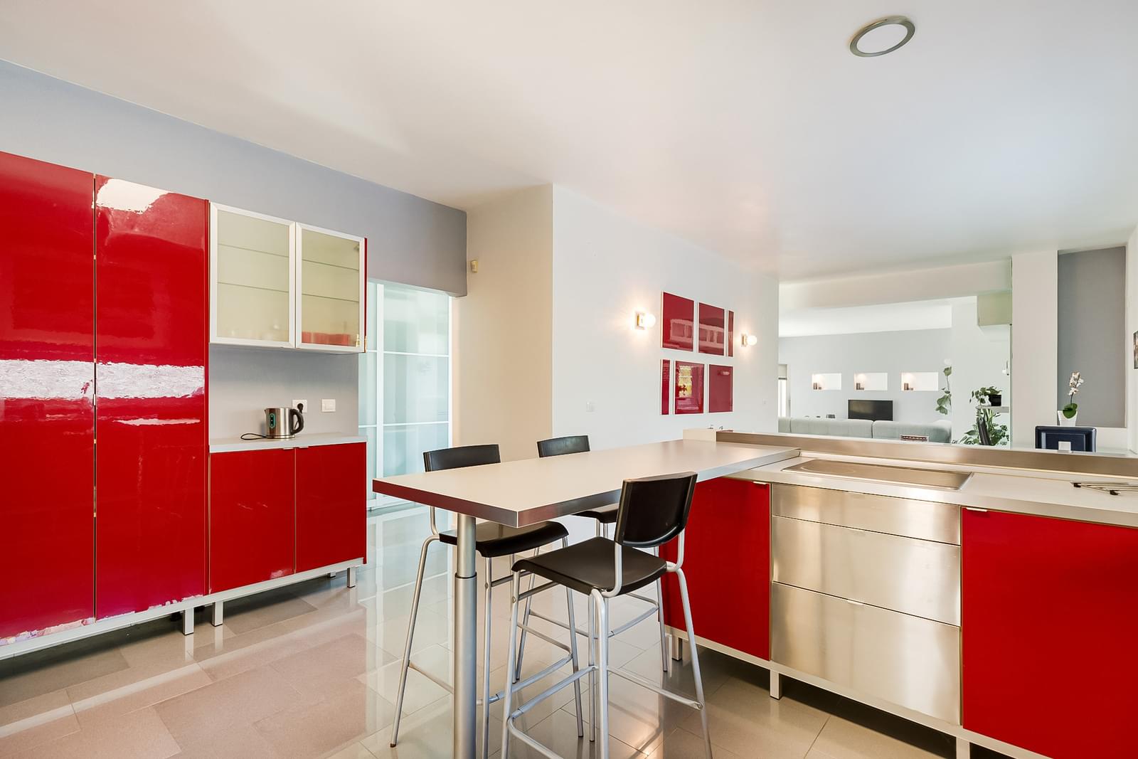 With modern architecture and a ventilated façade system in ALUCOBOND, this villa has great thermal comfort and quality finishes. We can highlight its aluminum window frames with double glazed windows with thermal and acoustic cut, electrical blinds, “Revigrés” ceramic flooring, “Zanussi” ceramic hob, oven and microwave in the kitchen, “Bosch” water heater in the laundry area, suspended sanitary ware, video intercom, full alarm, air conditioning, interior doors in frosted glass, indirect exterior lighting, automatic gates with thermal cut equal to the blinds, among others.