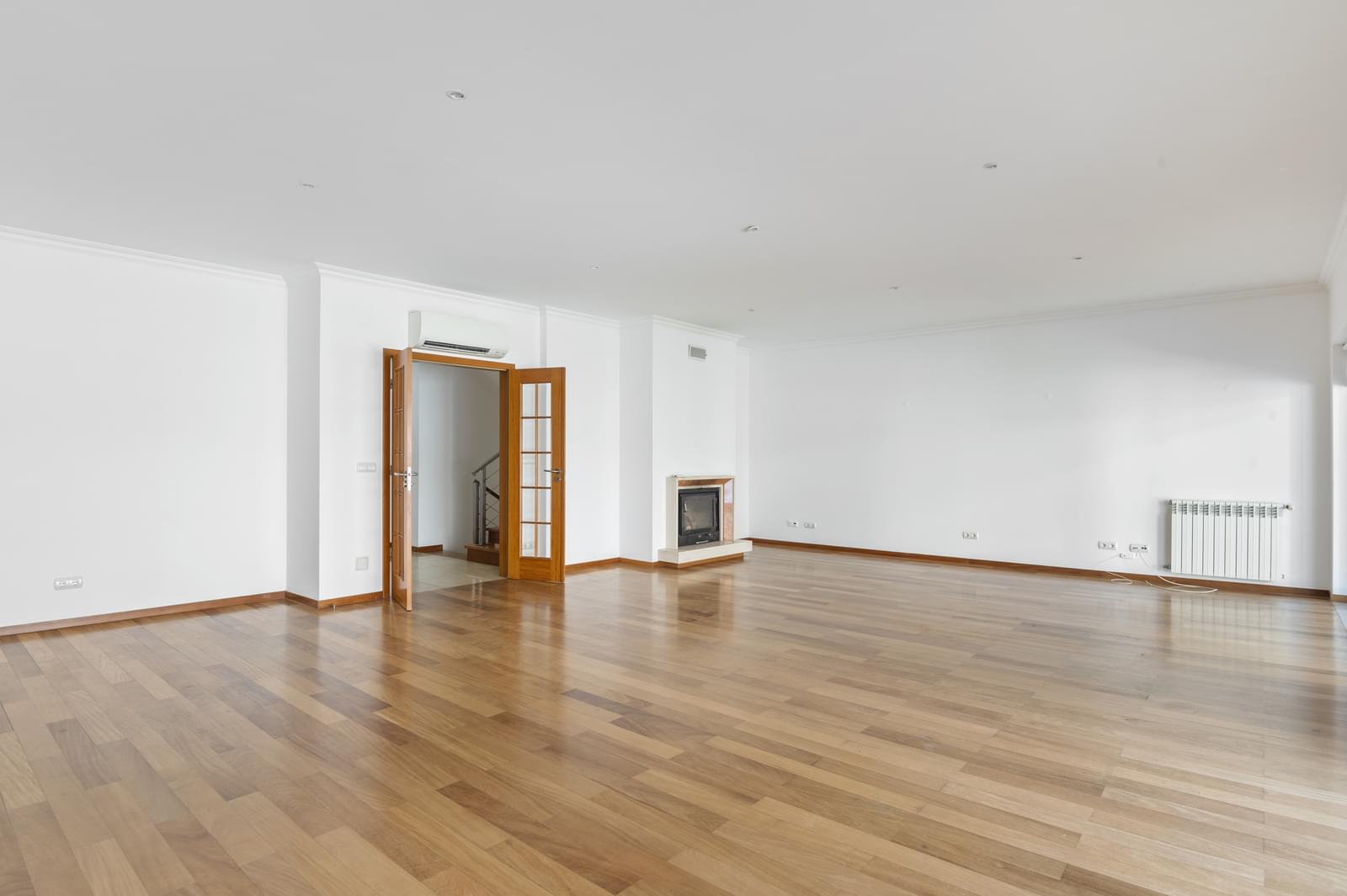 Sala comum com lareira e recuperador de calor, que dá acesso a um terraço exterior;